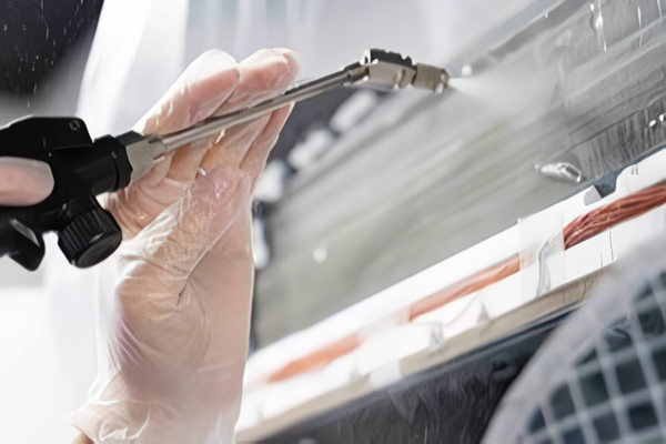 エアコン本体の洗浄完了後、取り外したエアコンカバーや部品を手洗いしていきます。高圧洗浄機を使用し、ブラシで細部まで綺麗に清掃します。